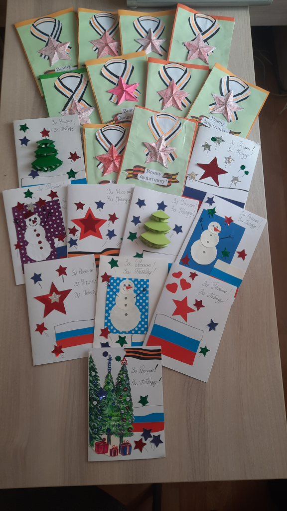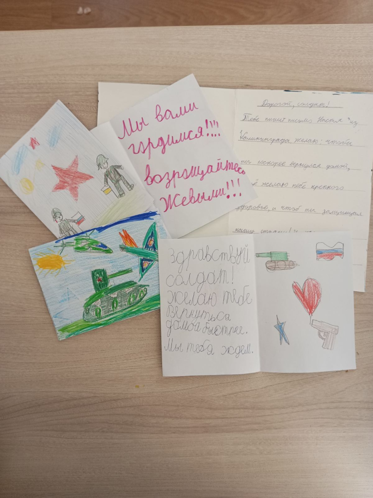 Дети подготовили для наших воинов праздничные новогодние открытки и рисунки. В своих письмах юные калининградцы высказали слова поддержки тем, кто сейчас находится на передовой, защищает права и свободы людей.