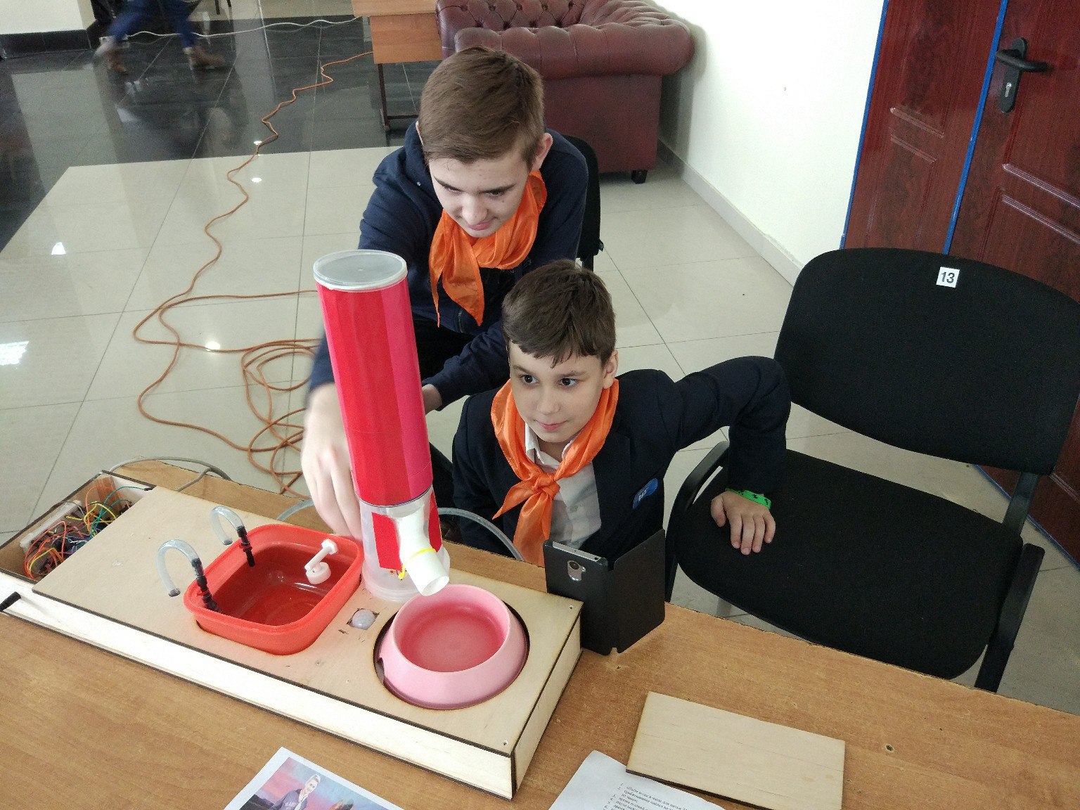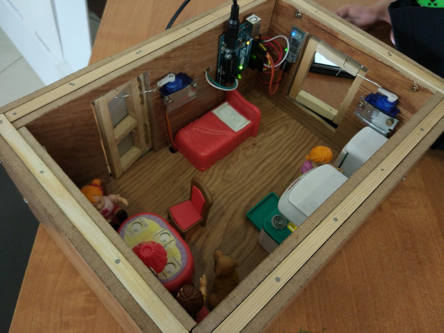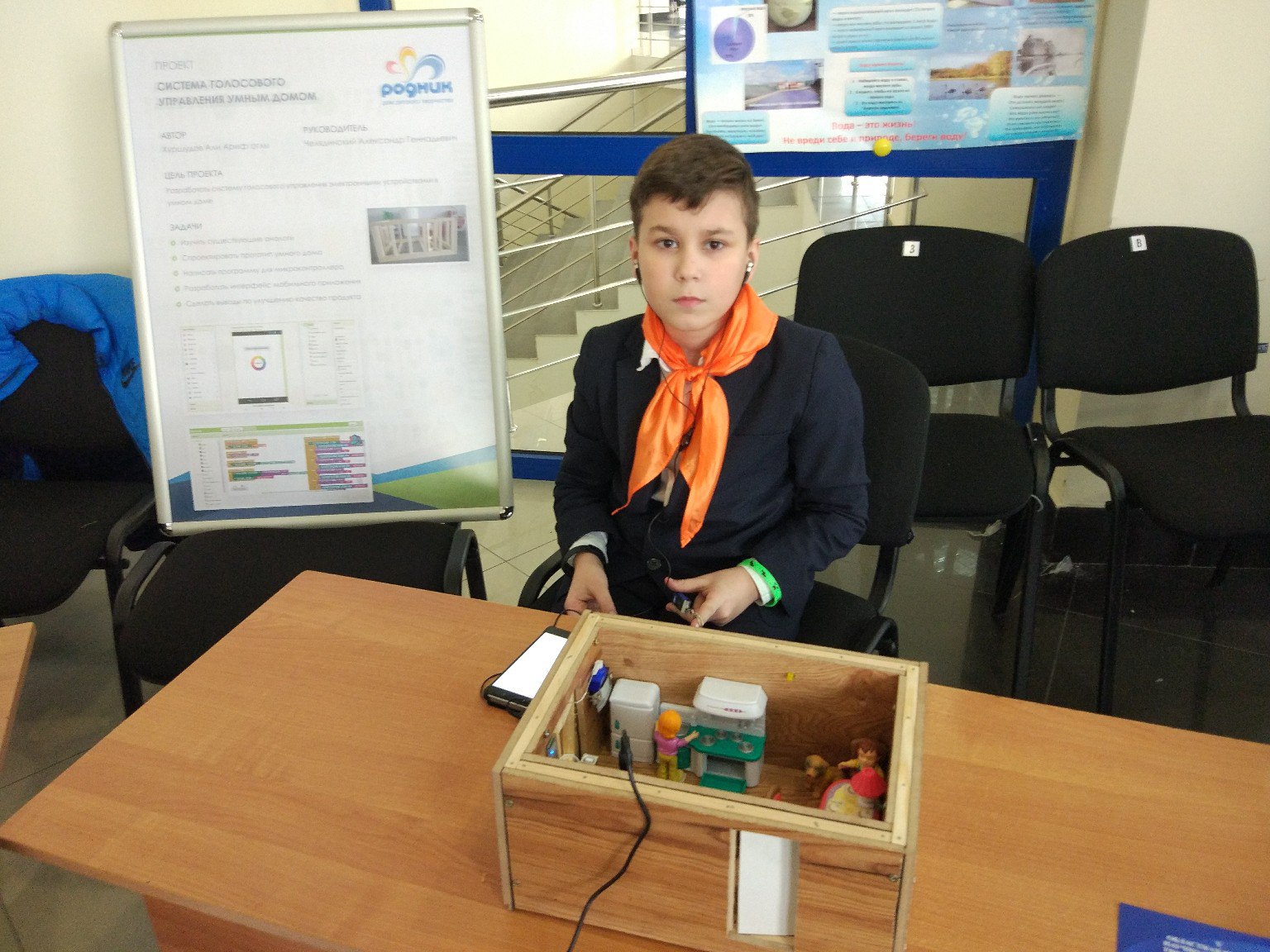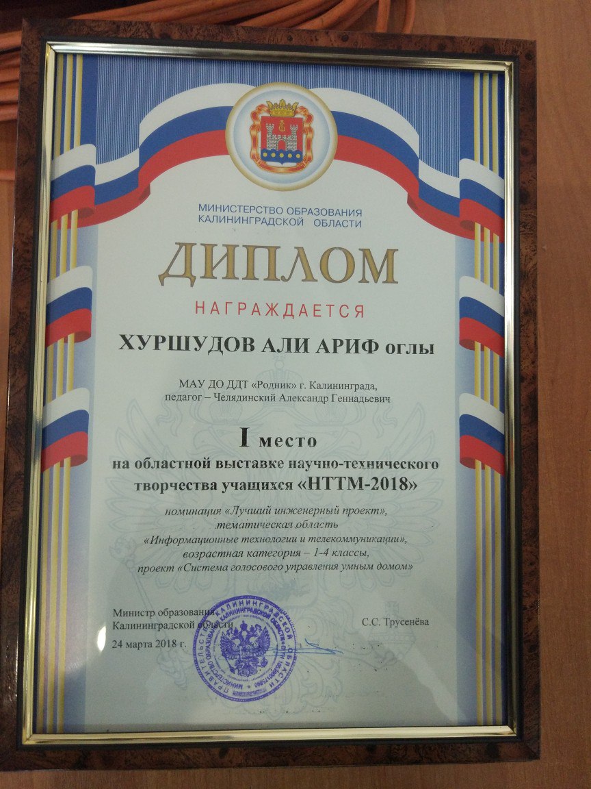 Первое место в возрастной категории 1-4 класс занял Али Хуршудов из четырех заявленных проектов. Он выступал с проектом «Система голосового управления в умном доме». Сама конструкция, собранная из деревянных брусков и ламината со светодиодами, моторчиком для открывания двери, прочими имитаторами современного особняка была интересна, но изюминкой все-таки являлась программа голосового управления им через собственное мобильное приложение с помощью сервисов Google.