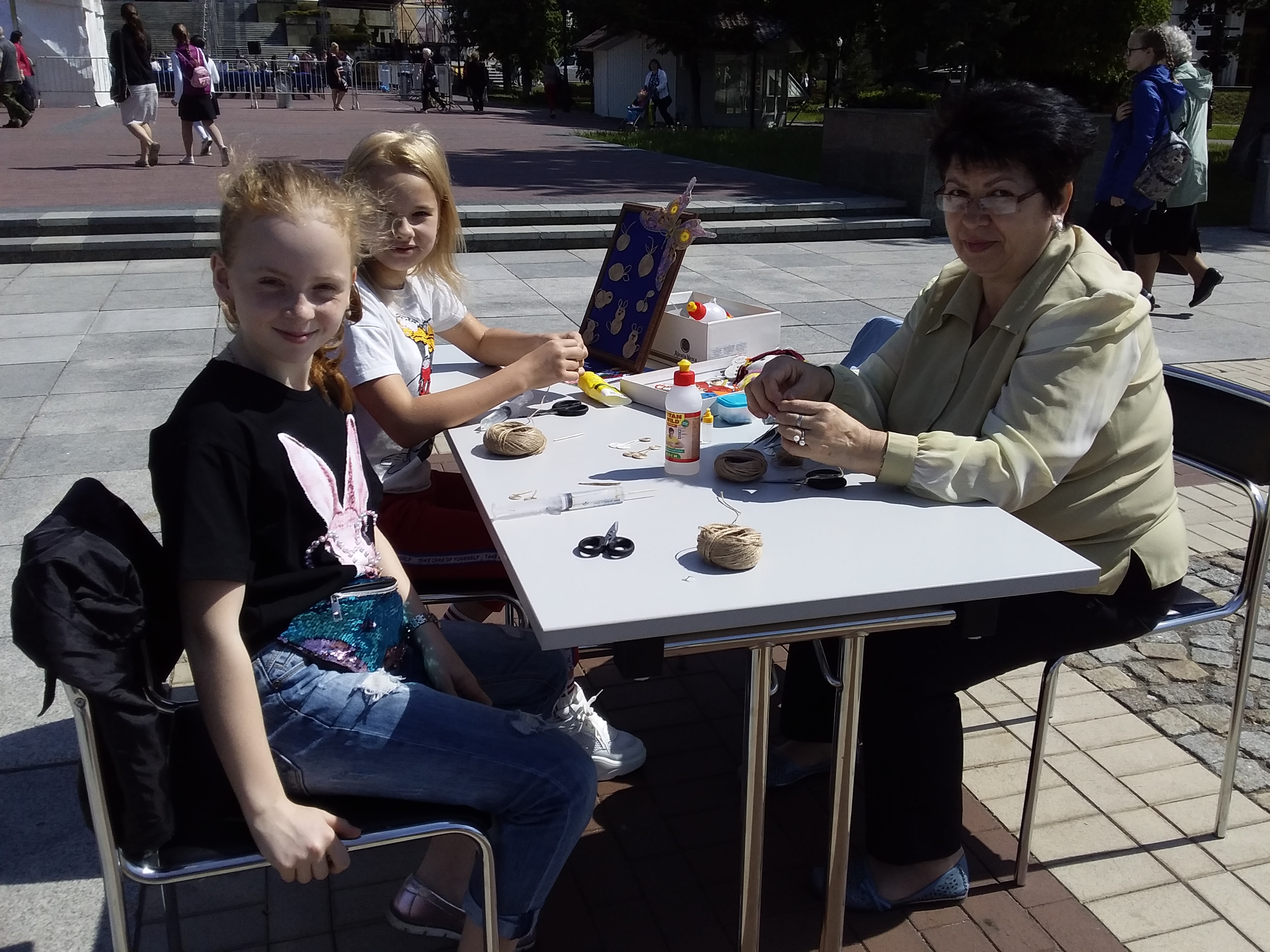 Вместе со своими учениками они приглашали всех желающих познакомиться с интересными видами рукоделия: плетением жгутов из нитей на самодельных станках и созданием миниатюр в технике джутовая филигрань.