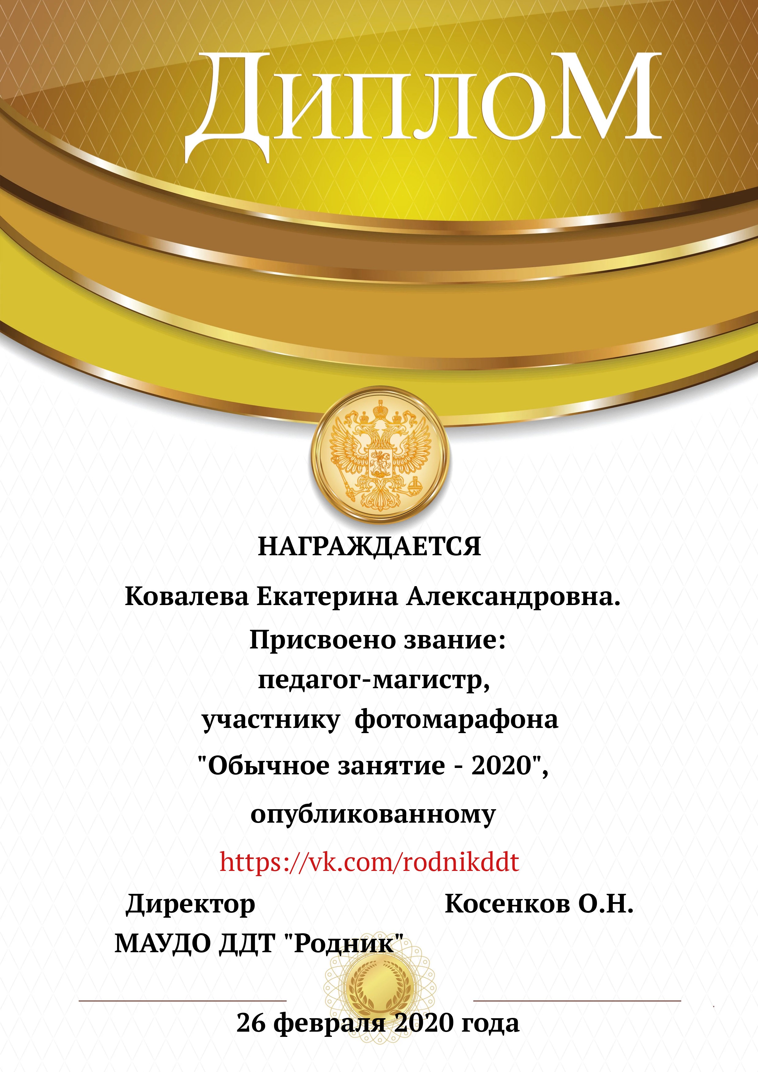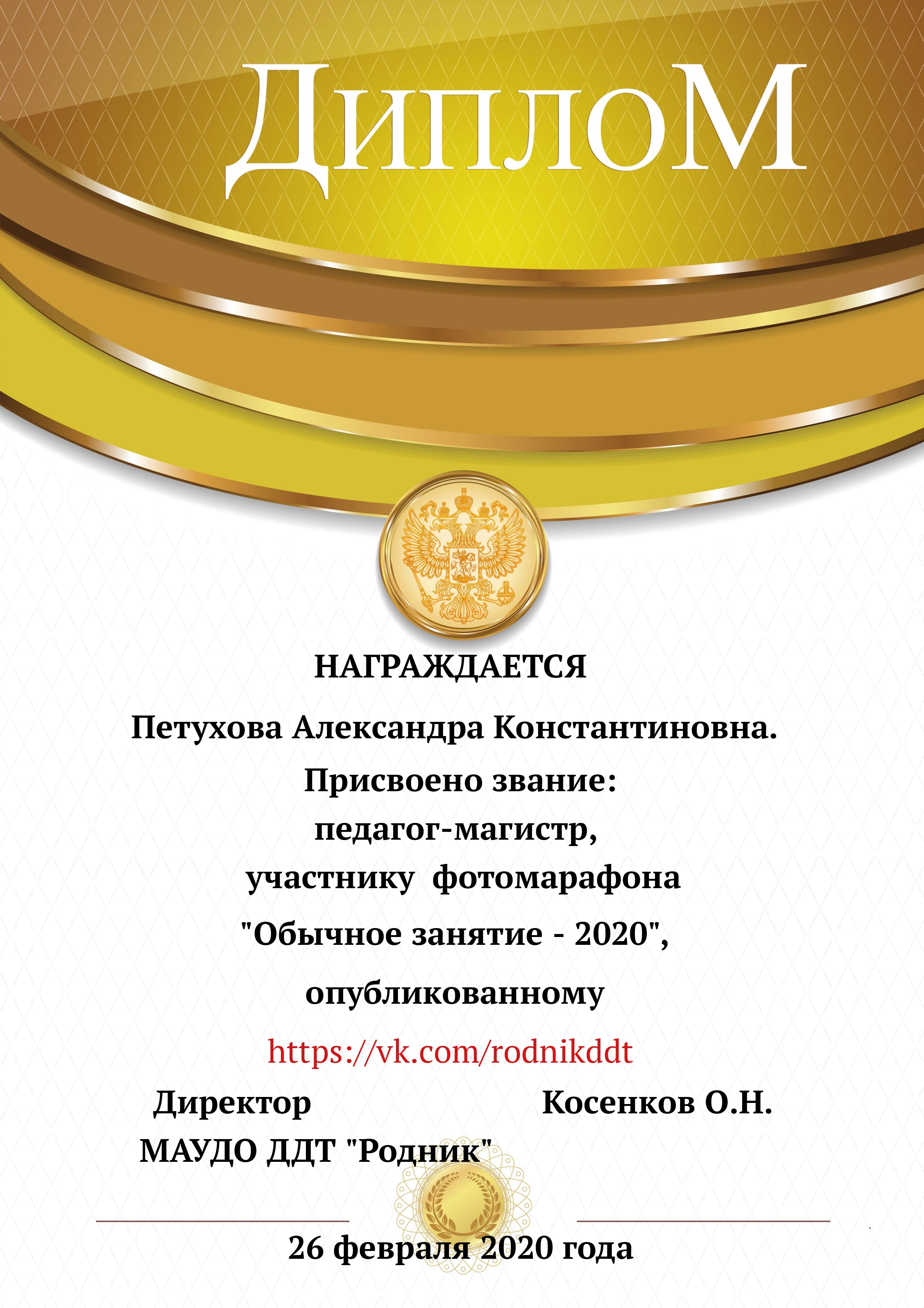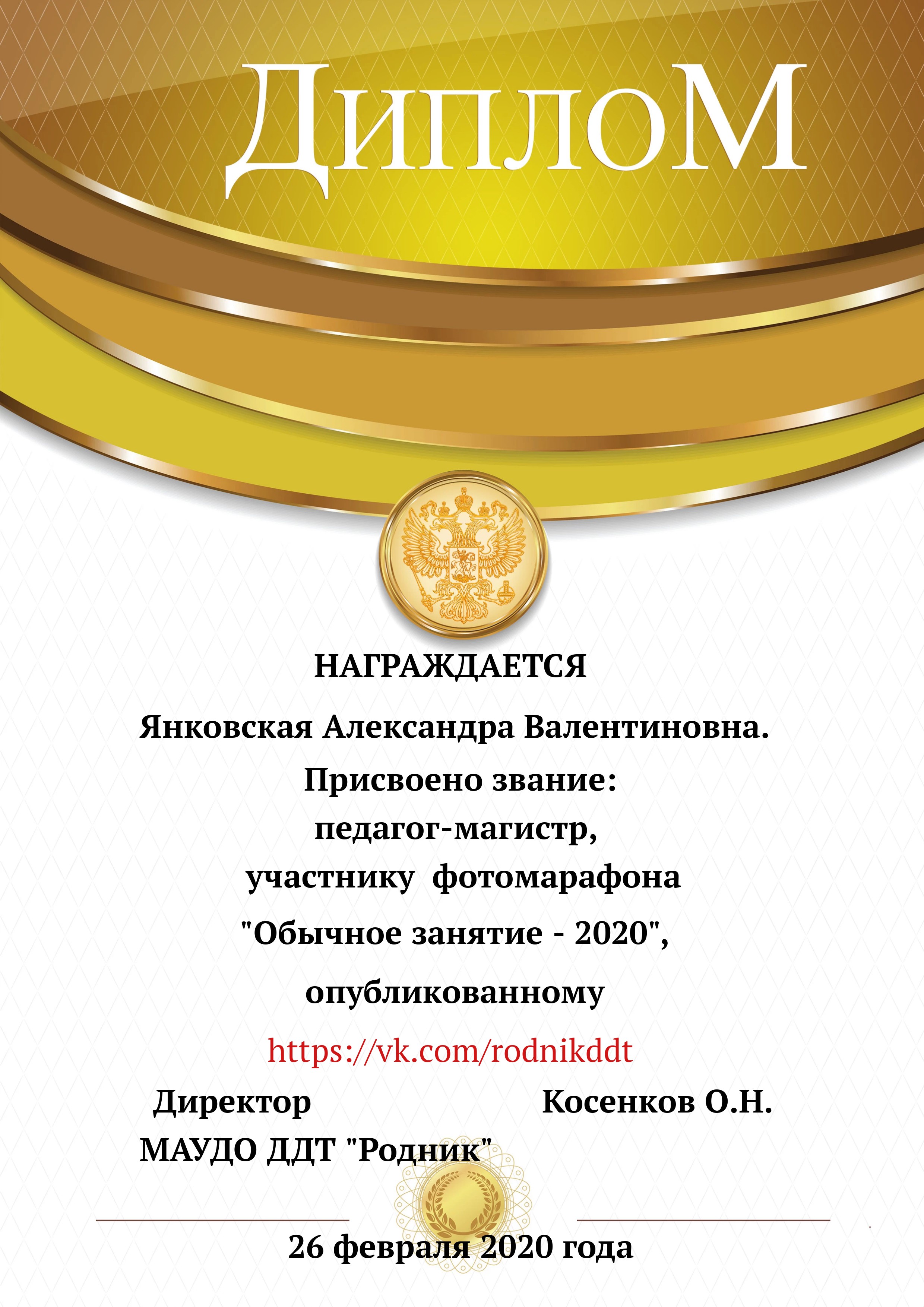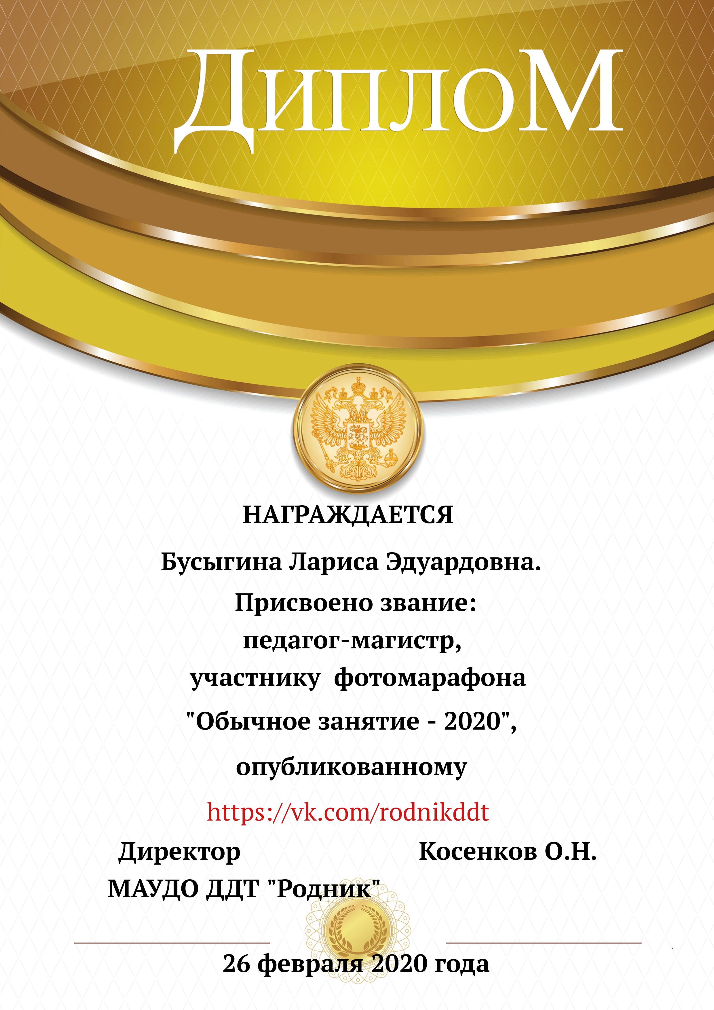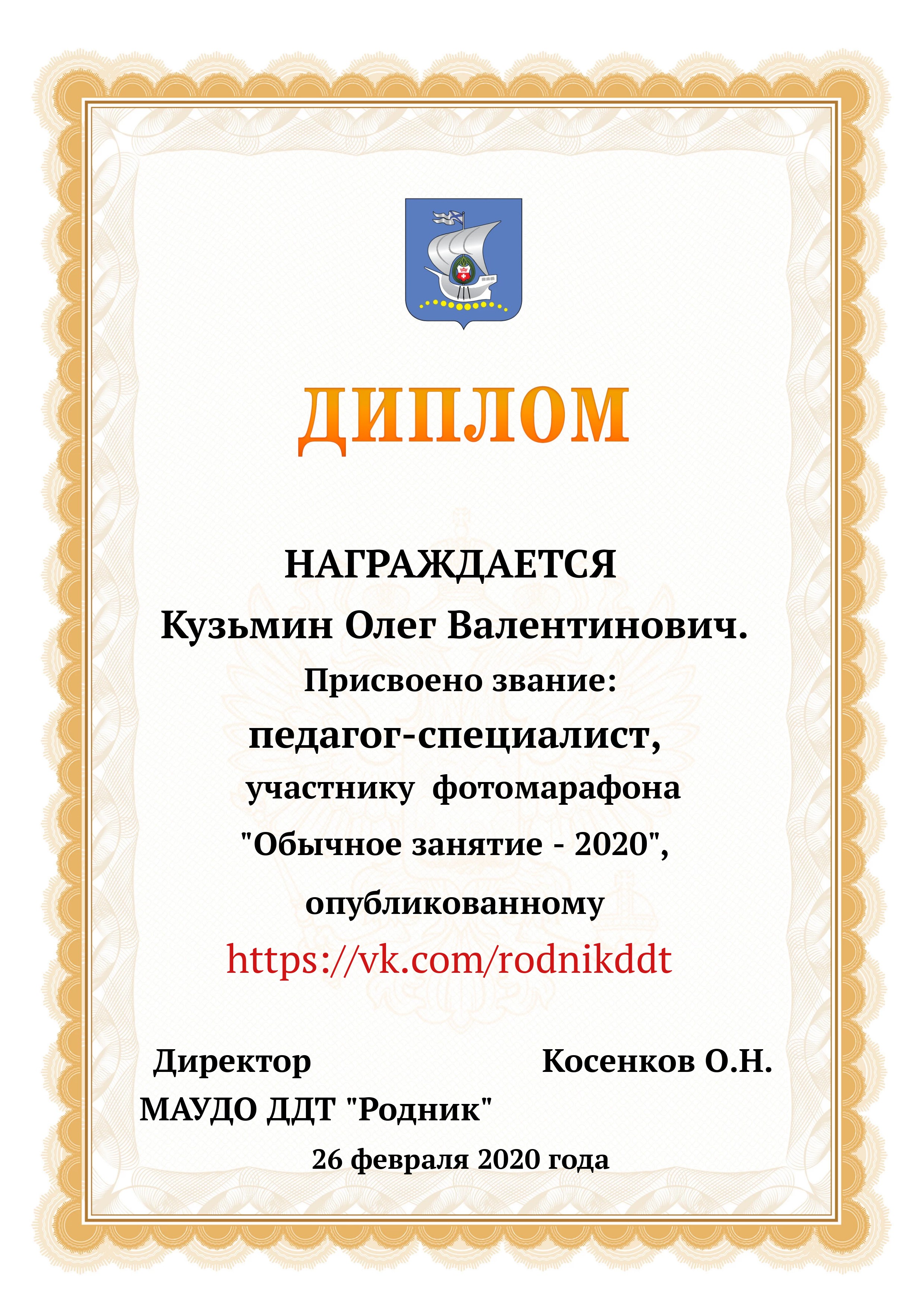 «О проведении конкурса «Лучший фотоотчет занятия»» 1) с 13.02.2020 по 20.02.2020 в конкурсе приняли участие 18 педагогов, было опубликовано 20 уроков по всем реализуемым направленностям. 2) За время проведения открытого конкурса системой статистического наблюдения за группой «Дом Детского Творчества "Родник"» по адресу https://vk.com/rodnikddt, были получены следующие результаты, свидетельствующие об увеличении общественного интереса к занятиям, проводимым в ДДТ «Родник». Число подписчиков группы увеличилось на 47 человек. 3) Для повешения объективности оценки результатов проведенных занятия была создана форма, балльные отметки были просуммированы, путём получения среднего арифметического были вычислены отметки за методическую часть урока, а также присвоены звания за проведение занятий. Результаты марафона Педагог - специалист от 11. 00 до 13 баллов 1. Лаане Елена Вадимовна (не было опубликовано) 11.00 2. Наиль Ринатович Фахретдинов, "Создание игр в Unity3d." 11.67 3. Кузьмин Олег Валентинович, "Проектирование танка" 11.67 4. Хуршудова Александра Александровна, "Свободная сборка" 12.67 5. Наиль Ринатович Фахретдинов, "Движение по линии" 13.00 Педагог- магистр от 14. 00 до 15.67 баллов 1. Лукинов Павел Иванович, "Линейный мат ладьёй и ферзём " 14.00 2. Бусыгина Лариса Эдуардовна, "Узор “Роза” 14.00 3. Ковалева Екатерина Александровна, "Лепка из пласта" 14.33 4. Камушкова Светлана Александровна, "Безопасный город" 14.33 5. Василегина Наталья Юрьевна, " Создание эстампа " 14.67 6. Камушкова Светлана Александровна, "Лимонный вулкан" 15.00 7. Петухова Александра Константиновна, "Техника ног..." 15.33 8. Янковская Александра Валентиновна, "Отработка " 15.67 Педагог - методист от 17.00 до 17.33 баллов 1. Пронько Мария Владимировна "День святого Валентина" 17.00 2. Кравцова Алёна Николаевна "Портрет папы" 17 3. Марченко Лариса Владимировна "“Our pets” 17.33 4. Мисёнг Дарья Сергеевна "Концертная деятельность, Амбер фест" 17.33 Победителями признаны: 1. Одегова Евгения Валериевна "Буквы Е и Ё" 19.33 2. Полянцева Светлана Анатольевна «Цифровая открытка» 20.00 3. Шестакова Зинаида Наильевна, "Моя семья" 20.33 Отдельно отмечены за развитие Интернет - сообщества и поддержку группы педагоги и родители: 1. Янковская А.В. в номинации "Поддержка профессионального сообщества". 2. Петухова А.К. в номинации "Открытие года". 3. Ковалева Е.А. в номинации "Лучший мастер -класс" 4. Лукинов П.И, Мисёнг Д.С., Хуршудова А.А. Пронько М.В. в номинации "Поддержка родительского сообщества". 5. Марина Глебова и Ксения Иванова в номинации "Самый трогательный отзыв".