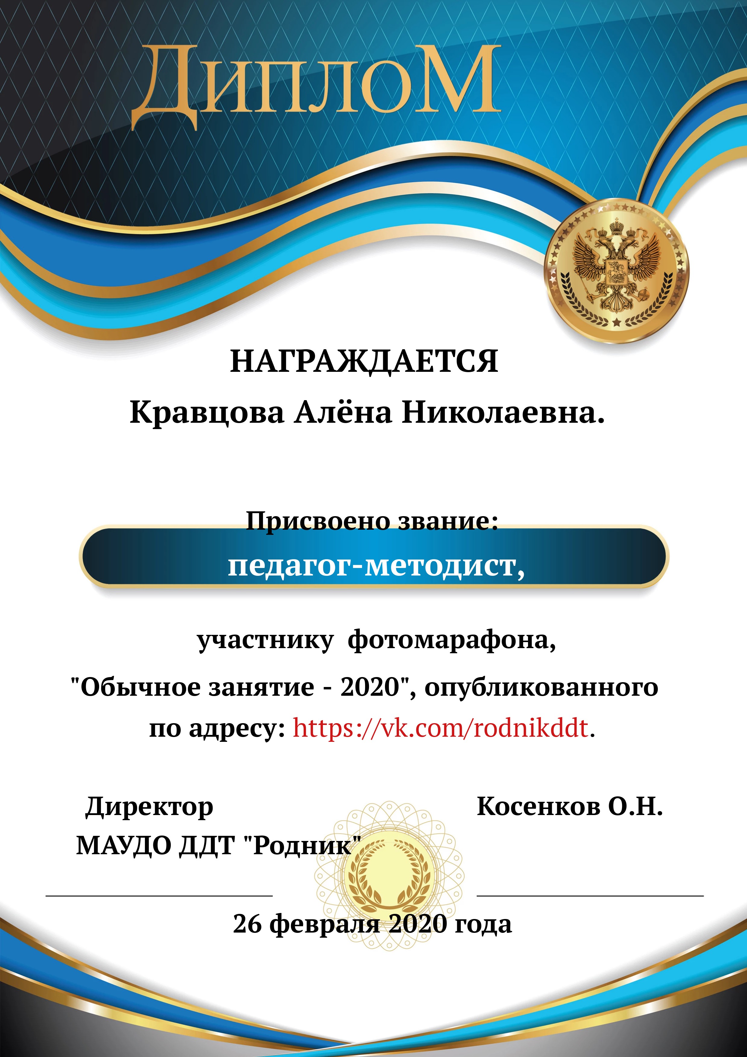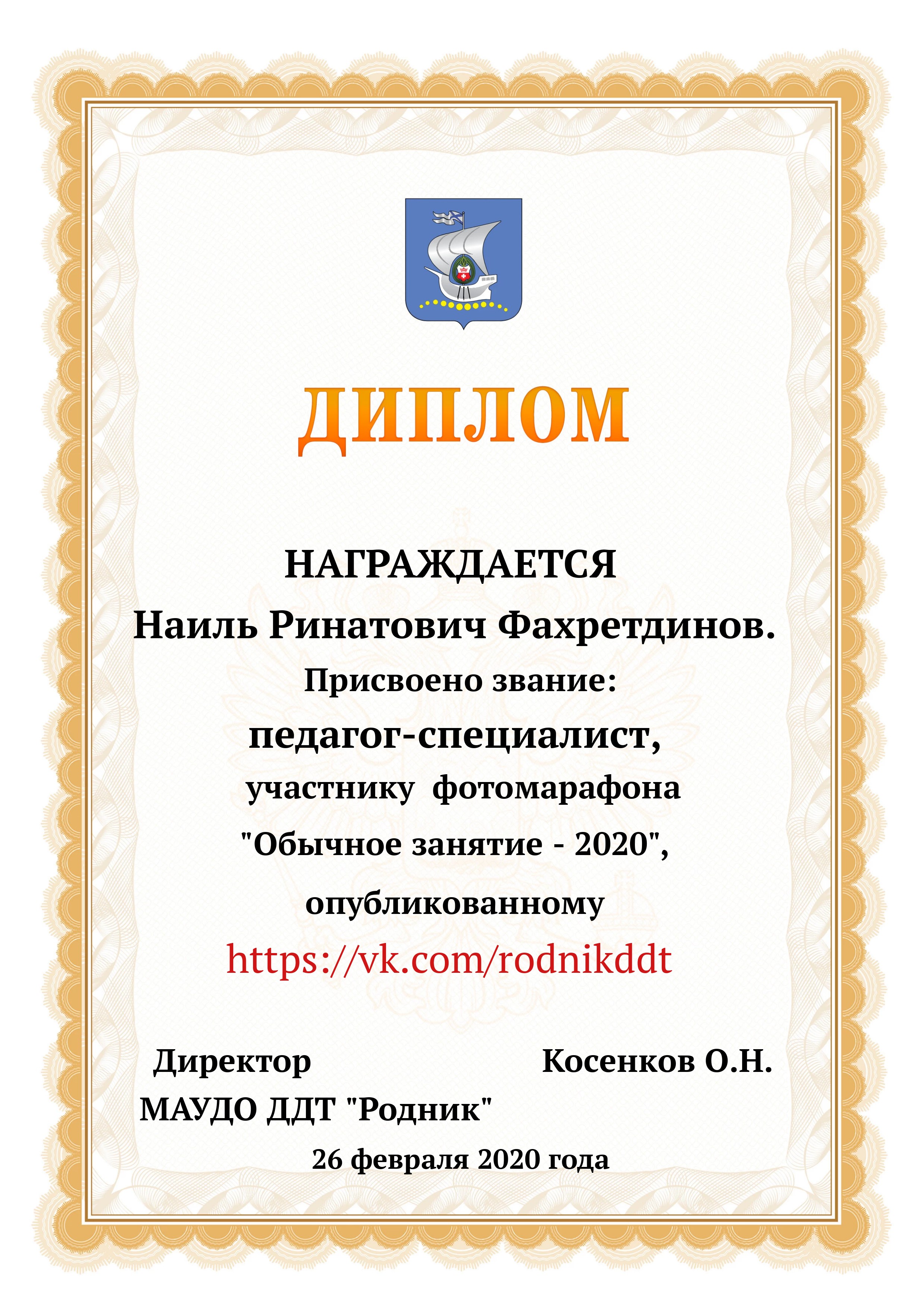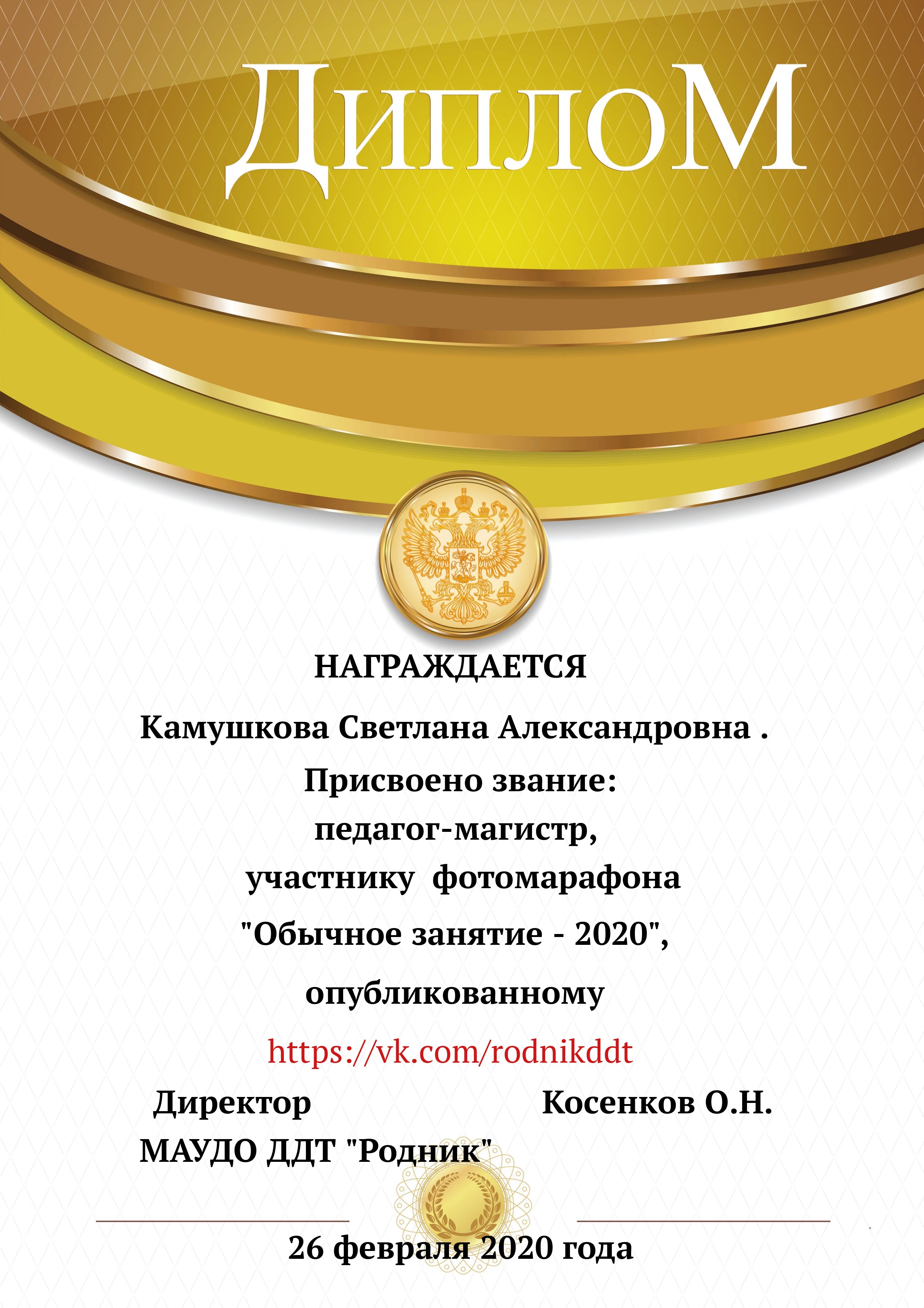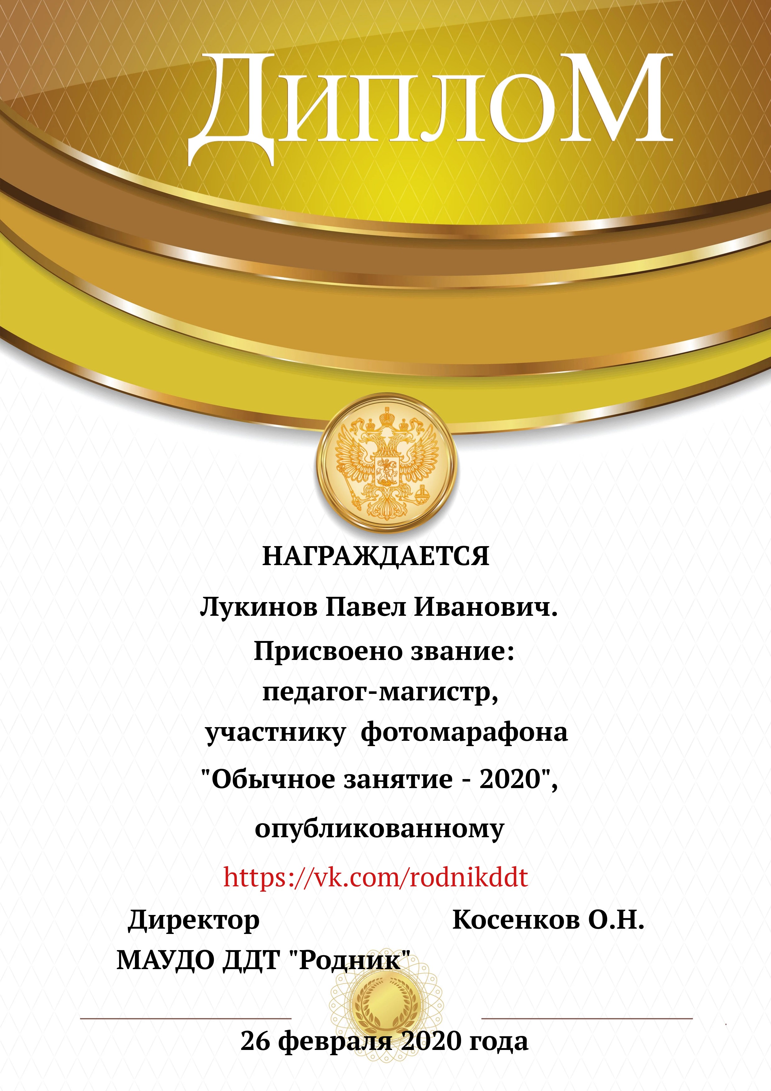 «О проведении конкурса «Лучший фотоотчет занятия»» 1) с 13.02.2020 по 20.02.2020 в конкурсе приняли участие 18 педагогов, было опубликовано 20 уроков по всем реализуемым направленностям. 2) За время проведения открытого конкурса системой статистического наблюдения за группой «Дом Детского Творчества "Родник"» по адресу https://vk.com/rodnikddt, были получены следующие результаты, свидетельствующие об увеличении общественного интереса к занятиям, проводимым в ДДТ «Родник». Число подписчиков группы увеличилось на 47 человек. 3) Для повешения объективности оценки результатов проведенных занятия была создана форма, балльные отметки были просуммированы, путём получения среднего арифметического были вычислены отметки за методическую часть урока, а также присвоены звания за проведение занятий. Результаты марафона Педагог - специалист от 11. 00 до 13 баллов 1. Лаане Елена Вадимовна (не было опубликовано) 11.00 2. Наиль Ринатович Фахретдинов, "Создание игр в Unity3d." 11.67 3. Кузьмин Олег Валентинович, "Проектирование танка" 11.67 4. Хуршудова Александра Александровна, "Свободная сборка" 12.67 5. Наиль Ринатович Фахретдинов, "Движение по линии" 13.00 Педагог- магистр от 14. 00 до 15.67 баллов 1. Лукинов Павел Иванович, "Линейный мат ладьёй и ферзём " 14.00 2. Бусыгина Лариса Эдуардовна, "Узор “Роза” 14.00 3. Ковалева Екатерина Александровна, "Лепка из пласта" 14.33 4. Камушкова Светлана Александровна, "Безопасный город" 14.33 5. Василегина Наталья Юрьевна, " Создание эстампа " 14.67 6. Камушкова Светлана Александровна, "Лимонный вулкан" 15.00 7. Петухова Александра Константиновна, "Техника ног..." 15.33 8. Янковская Александра Валентиновна, "Отработка " 15.67 Педагог - методист от 17.00 до 17.33 баллов 1. Пронько Мария Владимировна "День святого Валентина" 17.00 2. Кравцова Алёна Николаевна "Портрет папы" 17 3. Марченко Лариса Владимировна "“Our pets” 17.33 4. Мисёнг Дарья Сергеевна "Концертная деятельность, Амбер фест" 17.33 Победителями признаны: 1. Одегова Евгения Валериевна "Буквы Е и Ё" 19.33 2. Полянцева Светлана Анатольевна «Цифровая открытка» 20.00 3. Шестакова Зинаида Наильевна, "Моя семья" 20.33 Отдельно отмечены за развитие Интернет - сообщества и поддержку группы педагоги и родители: 1. Янковская А.В. в номинации "Поддержка профессионального сообщества". 2. Петухова А.К. в номинации "Открытие года". 3. Ковалева Е.А. в номинации "Лучший мастер -класс" 4. Лукинов П.И, Мисёнг Д.С., Хуршудова А.А. Пронько М.В. в номинации "Поддержка родительского сообщества". 5. Марина Глебова и Ксения Иванова в номинации "Самый трогательный отзыв".