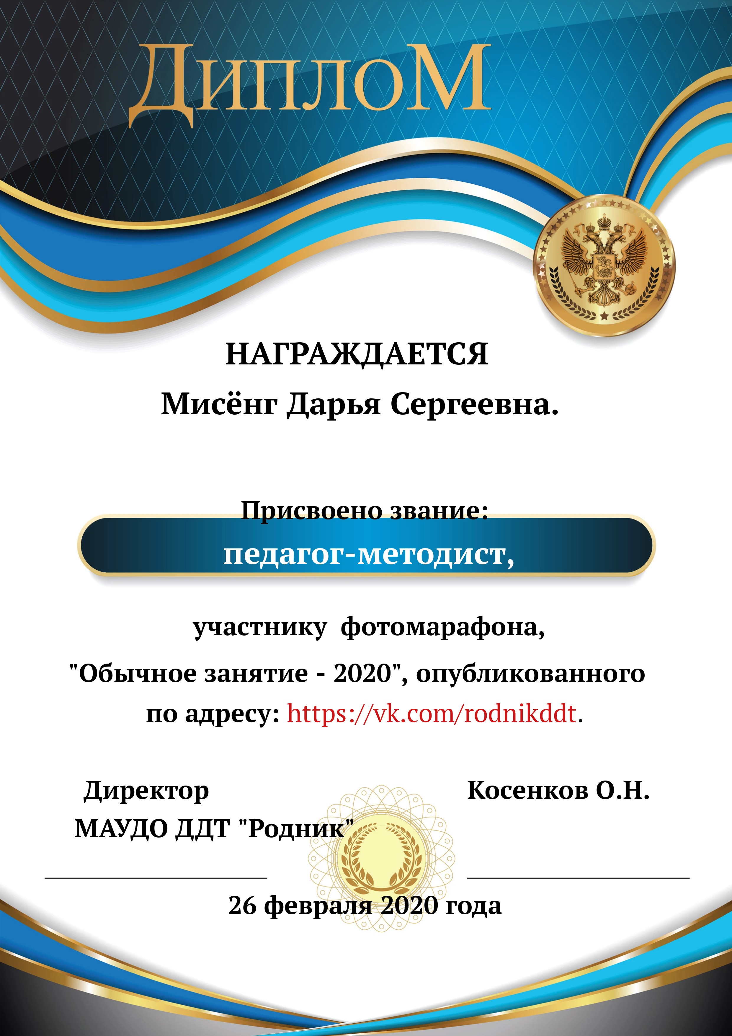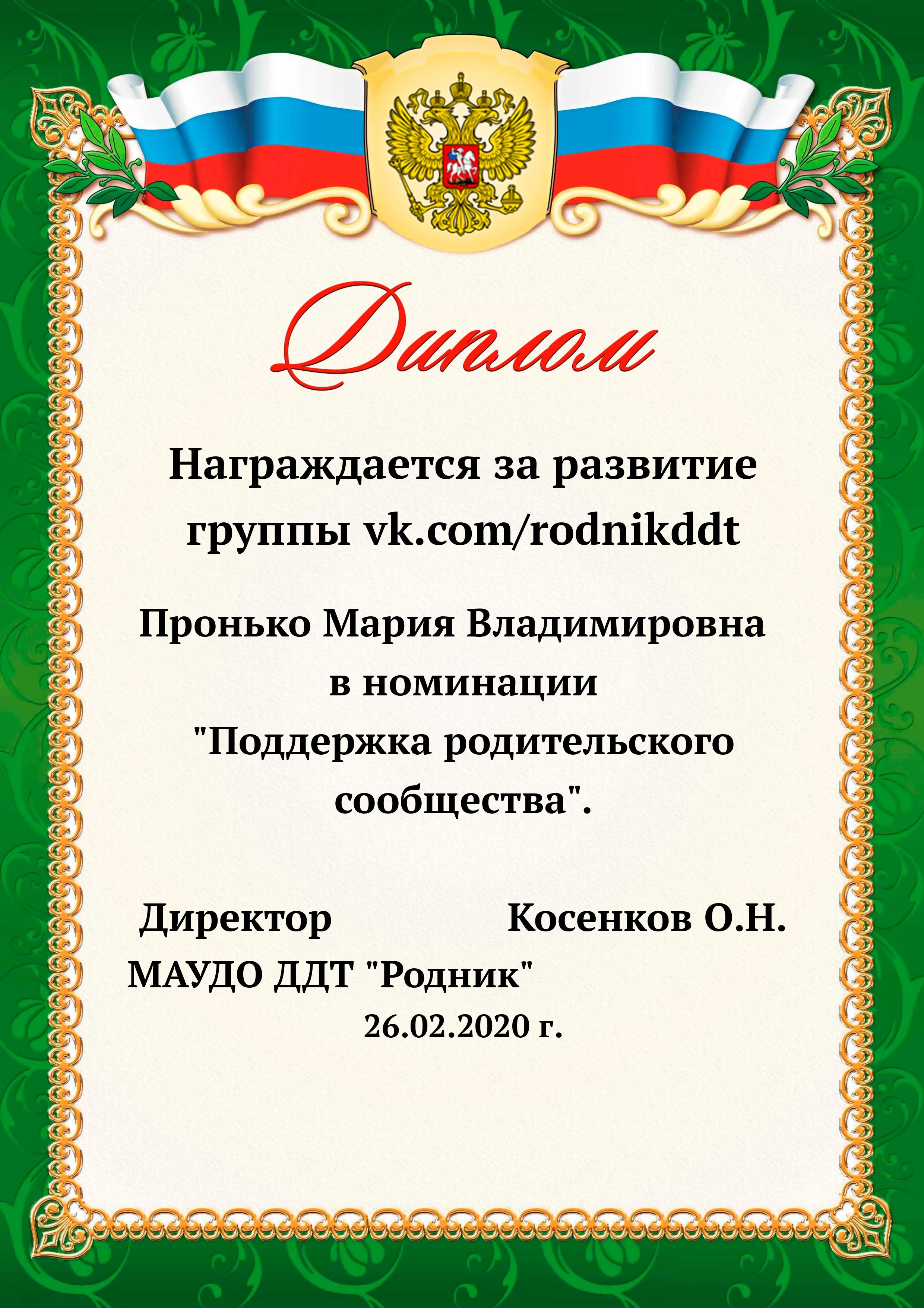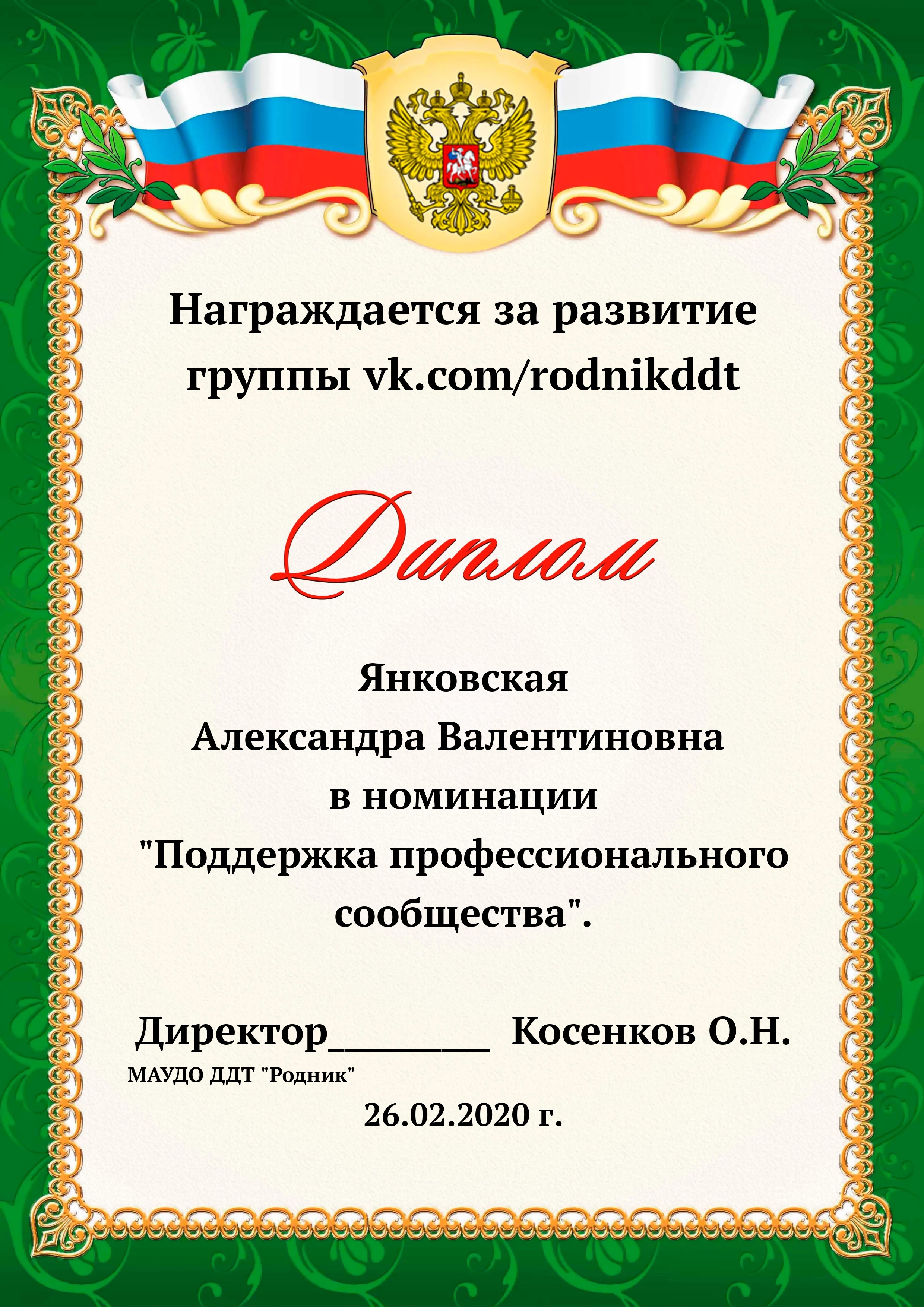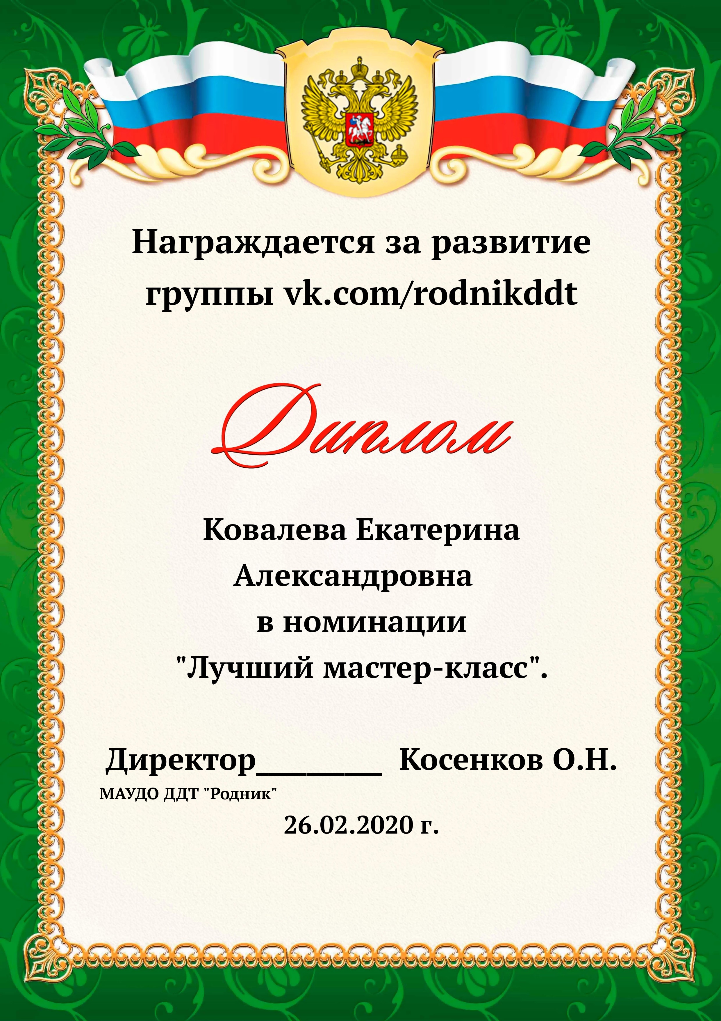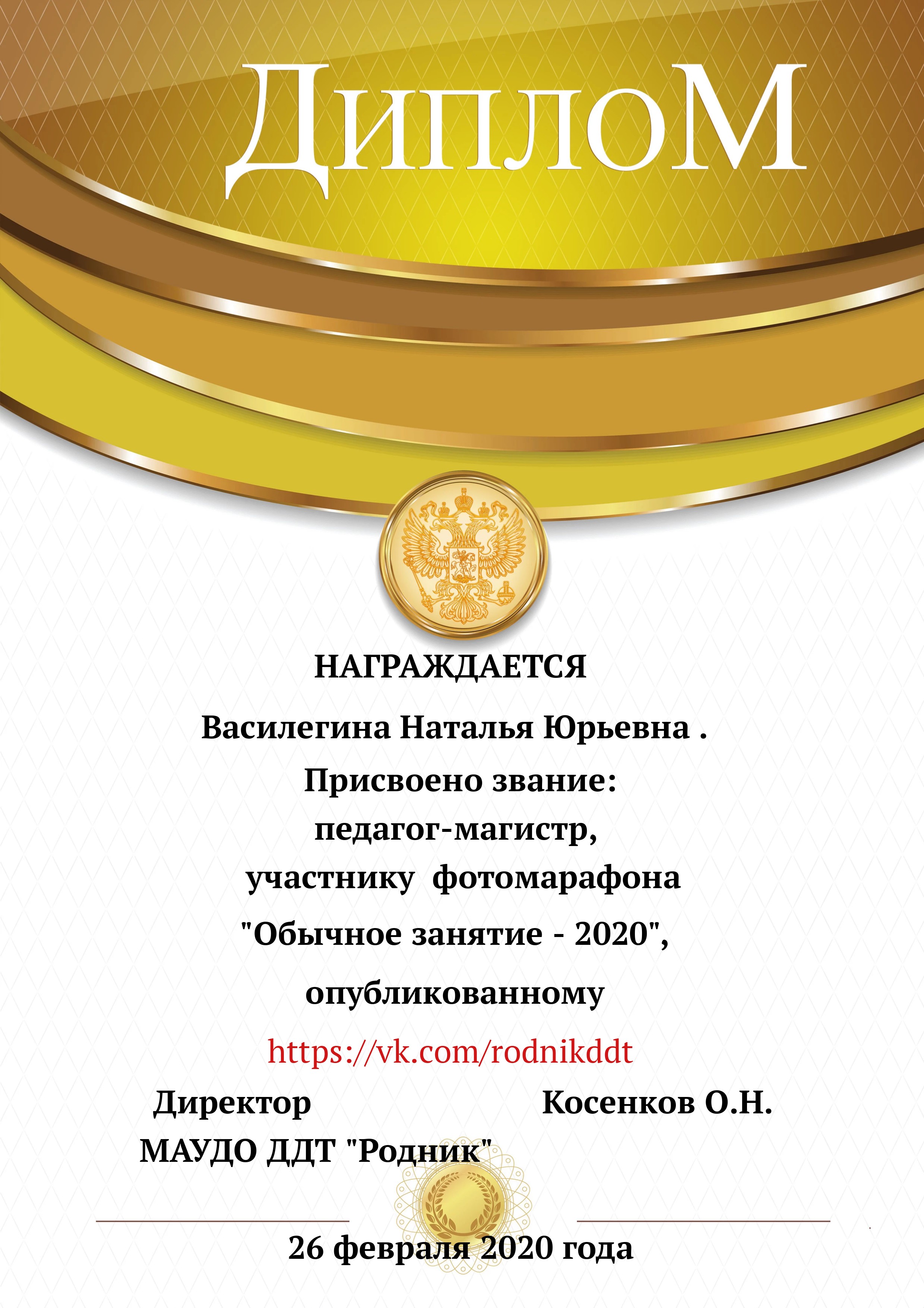 «О проведении конкурса «Лучший фотоотчет занятия»» 1) с 13.02.2020 по 20.02.2020 в конкурсе приняли участие 18 педагогов, было опубликовано 20 уроков по всем реализуемым направленностям. 2) За время проведения открытого конкурса системой статистического наблюдения за группой «Дом Детского Творчества "Родник"» по адресу https://vk.com/rodnikddt, были получены следующие результаты, свидетельствующие об увеличении общественного интереса к занятиям, проводимым в ДДТ «Родник». Число подписчиков группы увеличилось на 47 человек. 3) Для повешения объективности оценки результатов проведенных занятия была создана форма, балльные отметки были просуммированы, путём получения среднего арифметического были вычислены отметки за методическую часть урока, а также присвоены звания за проведение занятий. Результаты марафона Педагог - специалист от 11. 00 до 13 баллов 1. Лаане Елена Вадимовна (не было опубликовано) 11.00 2. Наиль Ринатович Фахретдинов, "Создание игр в Unity3d." 11.67 3. Кузьмин Олег Валентинович, "Проектирование танка" 11.67 4. Хуршудова Александра Александровна, "Свободная сборка" 12.67 5. Наиль Ринатович Фахретдинов, "Движение по линии" 13.00 Педагог- магистр от 14. 00 до 15.67 баллов 1. Лукинов Павел Иванович, "Линейный мат ладьёй и ферзём " 14.00 2. Бусыгина Лариса Эдуардовна, "Узор “Роза” 14.00 3. Ковалева Екатерина Александровна, "Лепка из пласта" 14.33 4. Камушкова Светлана Александровна, "Безопасный город" 14.33 5. Василегина Наталья Юрьевна, " Создание эстампа " 14.67 6. Камушкова Светлана Александровна, "Лимонный вулкан" 15.00 7. Петухова Александра Константиновна, "Техника ног..." 15.33 8. Янковская Александра Валентиновна, "Отработка " 15.67 Педагог - методист от 17.00 до 17.33 баллов 1. Пронько Мария Владимировна "День святого Валентина" 17.00 2. Кравцова Алёна Николаевна "Портрет папы" 17 3. Марченко Лариса Владимировна "“Our pets” 17.33 4. Мисёнг Дарья Сергеевна "Концертная деятельность, Амбер фест" 17.33 Победителями признаны: 1. Одегова Евгения Валериевна "Буквы Е и Ё" 19.33 2. Полянцева Светлана Анатольевна «Цифровая открытка» 20.00 3. Шестакова Зинаида Наильевна, "Моя семья" 20.33 Отдельно отмечены за развитие Интернет - сообщества и поддержку группы педагоги и родители: 1. Янковская А.В. в номинации "Поддержка профессионального сообщества". 2. Петухова А.К. в номинации "Открытие года". 3. Ковалева Е.А. в номинации "Лучший мастер -класс" 4. Лукинов П.И, Мисёнг Д.С., Хуршудова А.А. Пронько М.В. в номинации "Поддержка родительского сообщества". 5. Марина Глебова и Ксения Иванова в номинации "Самый трогательный отзыв".