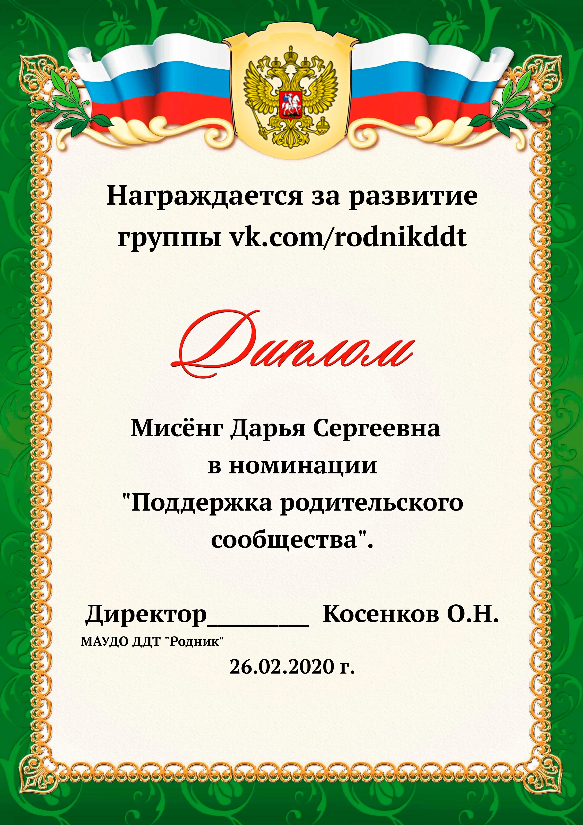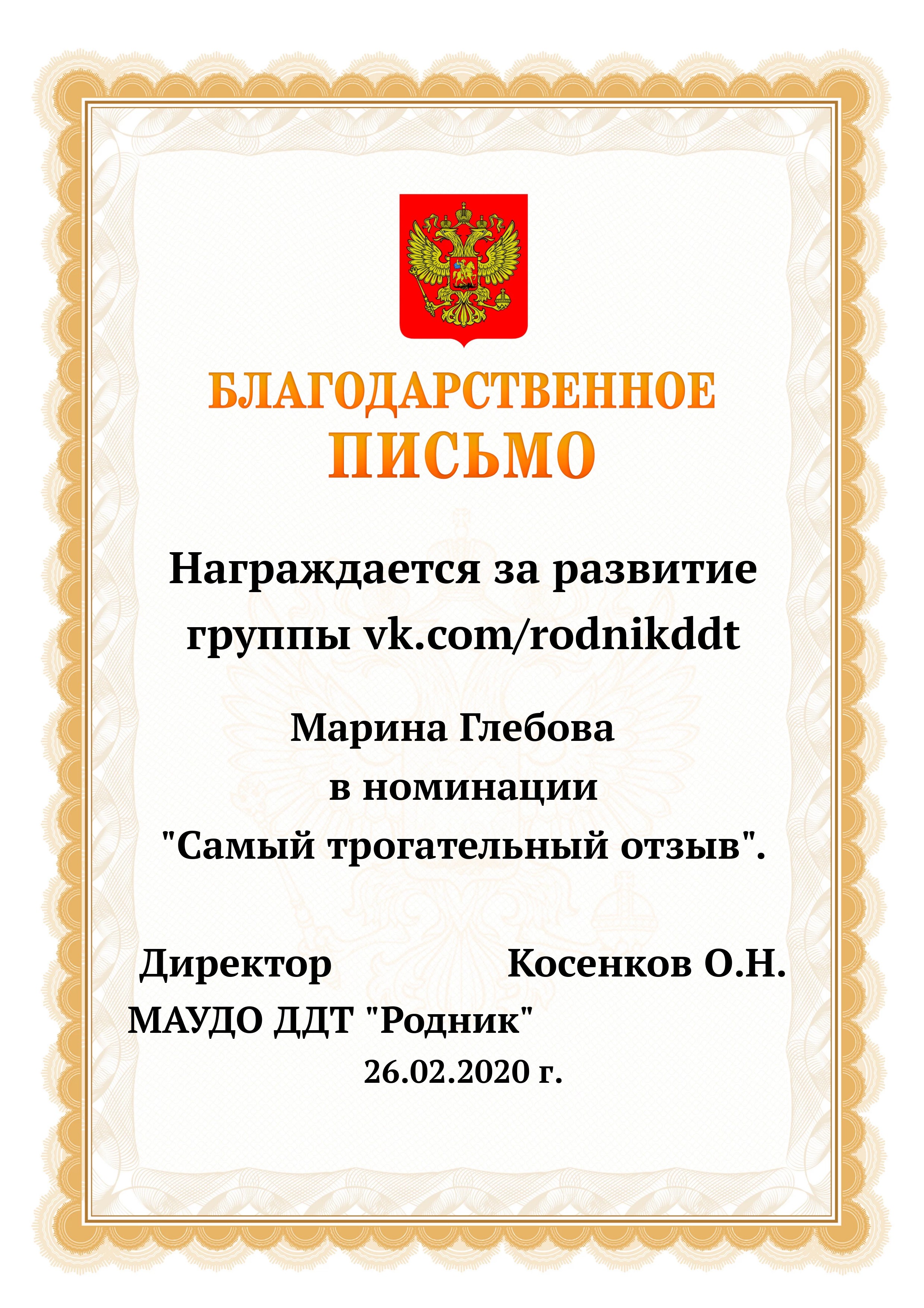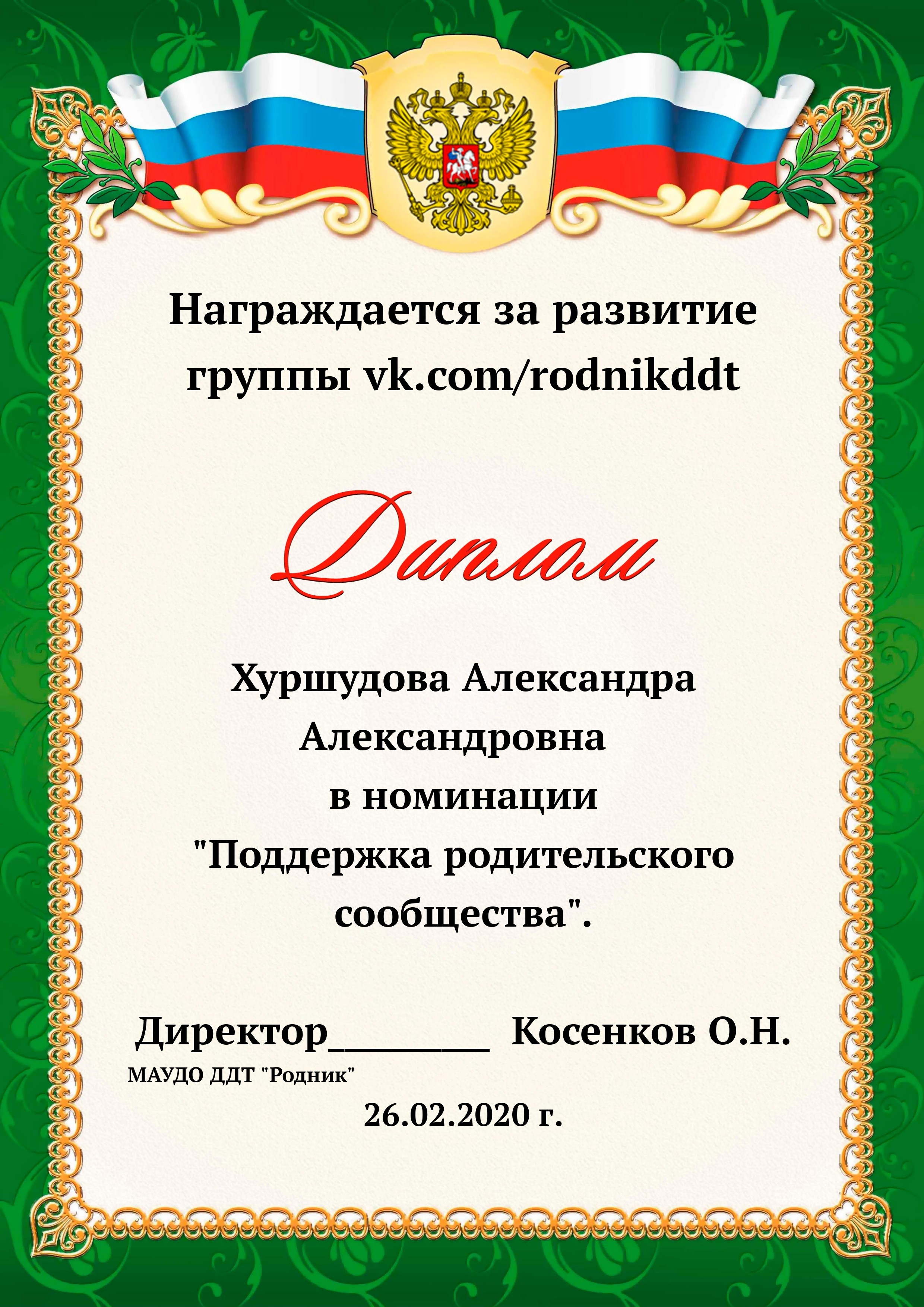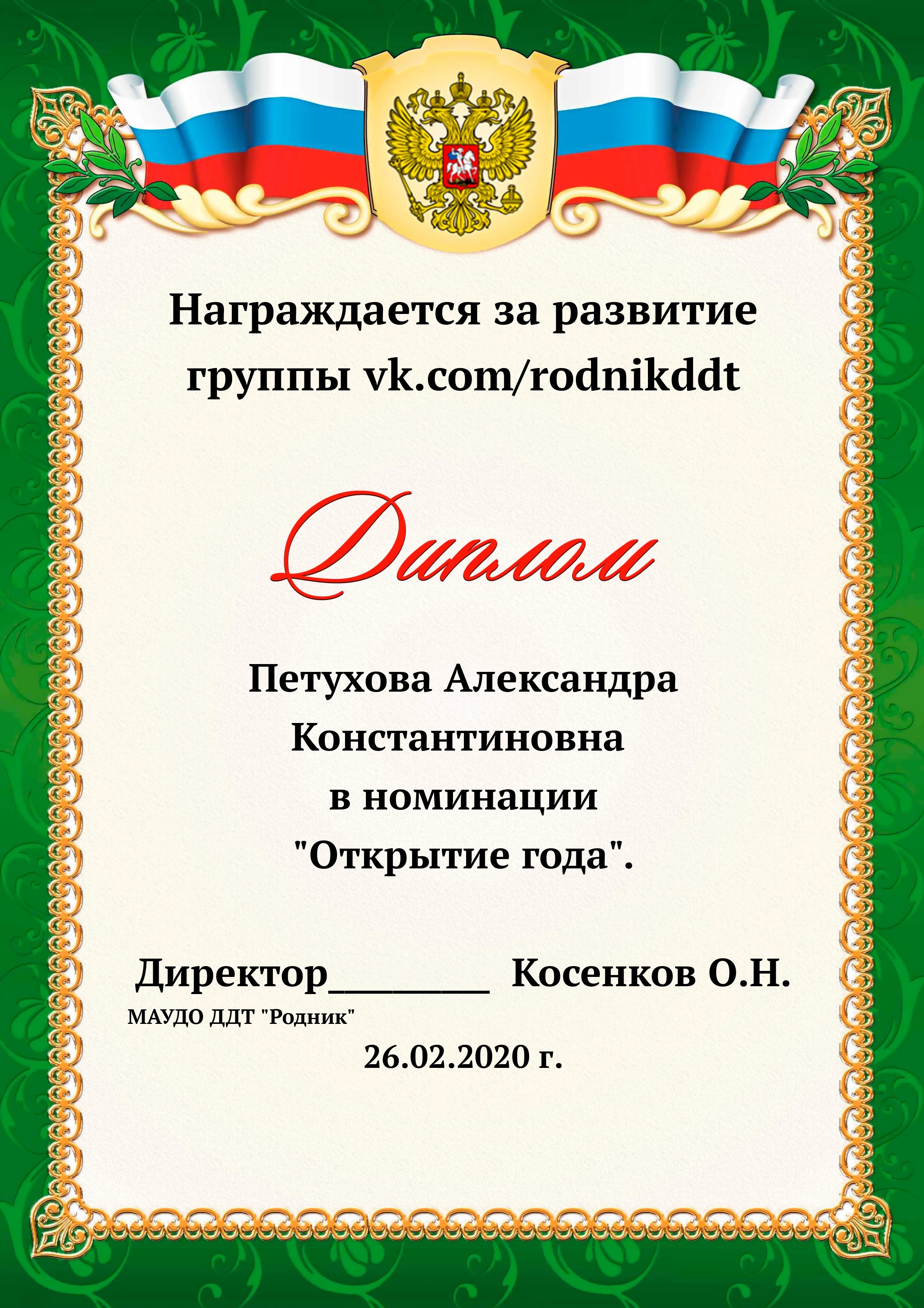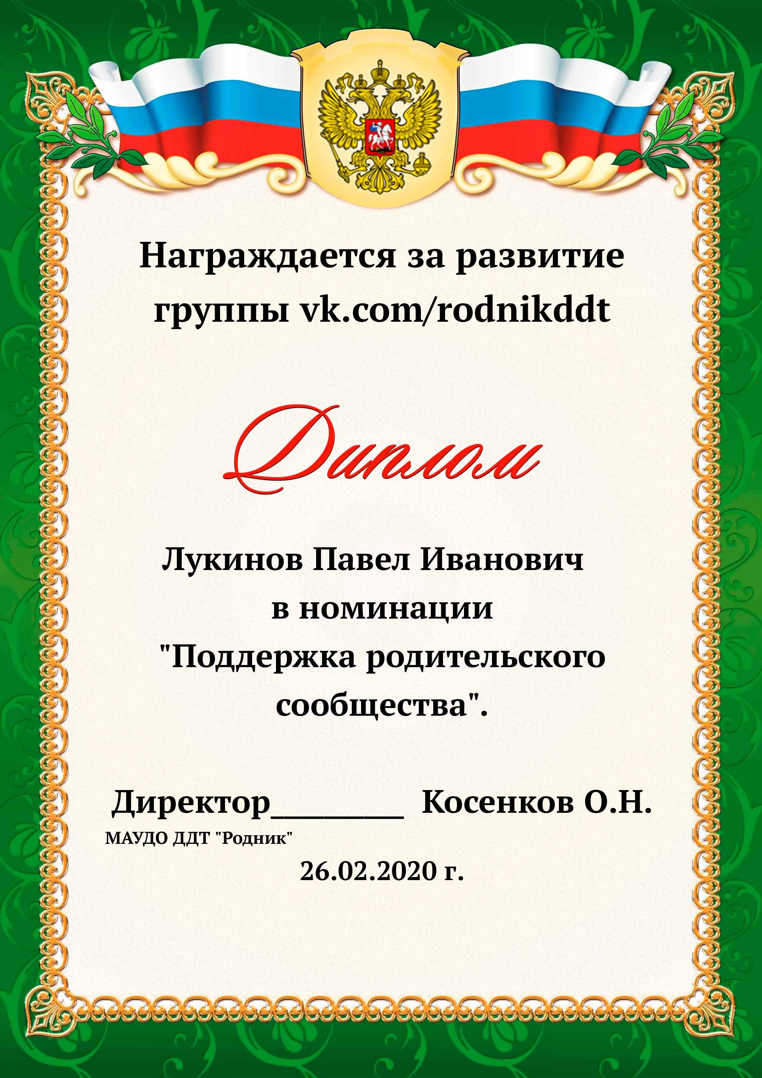 «О проведении конкурса «Лучший фотоотчет занятия»» 1) с 13.02.2020 по 20.02.2020 в конкурсе приняли участие 18 педагогов, было опубликовано 20 уроков по всем реализуемым направленностям. 2) За время проведения открытого конкурса системой статистического наблюдения за группой «Дом Детского Творчества "Родник"» по адресу https://vk.com/rodnikddt, были получены следующие результаты, свидетельствующие об увеличении общественного интереса к занятиям, проводимым в ДДТ «Родник». Число подписчиков группы увеличилось на 47 человек. 3) Для повешения объективности оценки результатов проведенных занятия была создана форма, балльные отметки были просуммированы, путём получения среднего арифметического были вычислены отметки за методическую часть урока, а также присвоены звания за проведение занятий. Результаты марафона Педагог - специалист от 11. 00 до 13 баллов 1. Лаане Елена Вадимовна (не было опубликовано) 11.00 2. Наиль Ринатович Фахретдинов, "Создание игр в Unity3d." 11.67 3. Кузьмин Олег Валентинович, "Проектирование танка" 11.67 4. Хуршудова Александра Александровна, "Свободная сборка" 12.67 5. Наиль Ринатович Фахретдинов, "Движение по линии" 13.00 Педагог- магистр от 14. 00 до 15.67 баллов 1. Лукинов Павел Иванович, "Линейный мат ладьёй и ферзём " 14.00 2. Бусыгина Лариса Эдуардовна, "Узор “Роза” 14.00 3. Ковалева Екатерина Александровна, "Лепка из пласта" 14.33 4. Камушкова Светлана Александровна, "Безопасный город" 14.33 5. Василегина Наталья Юрьевна, " Создание эстампа " 14.67 6. Камушкова Светлана Александровна, "Лимонный вулкан" 15.00 7. Петухова Александра Константиновна, "Техника ног..." 15.33 8. Янковская Александра Валентиновна, "Отработка " 15.67 Педагог - методист от 17.00 до 17.33 баллов 1. Пронько Мария Владимировна "День святого Валентина" 17.00 2. Кравцова Алёна Николаевна "Портрет папы" 17 3. Марченко Лариса Владимировна "“Our pets” 17.33 4. Мисёнг Дарья Сергеевна "Концертная деятельность, Амбер фест" 17.33 Победителями признаны: 1. Одегова Евгения Валериевна "Буквы Е и Ё" 19.33 2. Полянцева Светлана Анатольевна «Цифровая открытка» 20.00 3. Шестакова Зинаида Наильевна, "Моя семья" 20.33 Отдельно отмечены за развитие Интернет - сообщества и поддержку группы педагоги и родители: 1. Янковская А.В. в номинации "Поддержка профессионального сообщества". 2. Петухова А.К. в номинации "Открытие года". 3. Ковалева Е.А. в номинации "Лучший мастер -класс" 4. Лукинов П.И, Мисёнг Д.С., Хуршудова А.А. Пронько М.В. в номинации "Поддержка родительского сообщества". 5. Марина Глебова и Ксения Иванова в номинации "Самый трогательный отзыв".