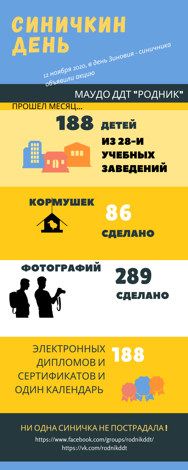 С 12 ноября по 12 декабря МАУДО ДДТ "Родник" проводил акцию, в ходе которой каждый желающий мог изготовить кормушку повесить ее и начать фотоохоту на посетителей персональной птичьей столовой.