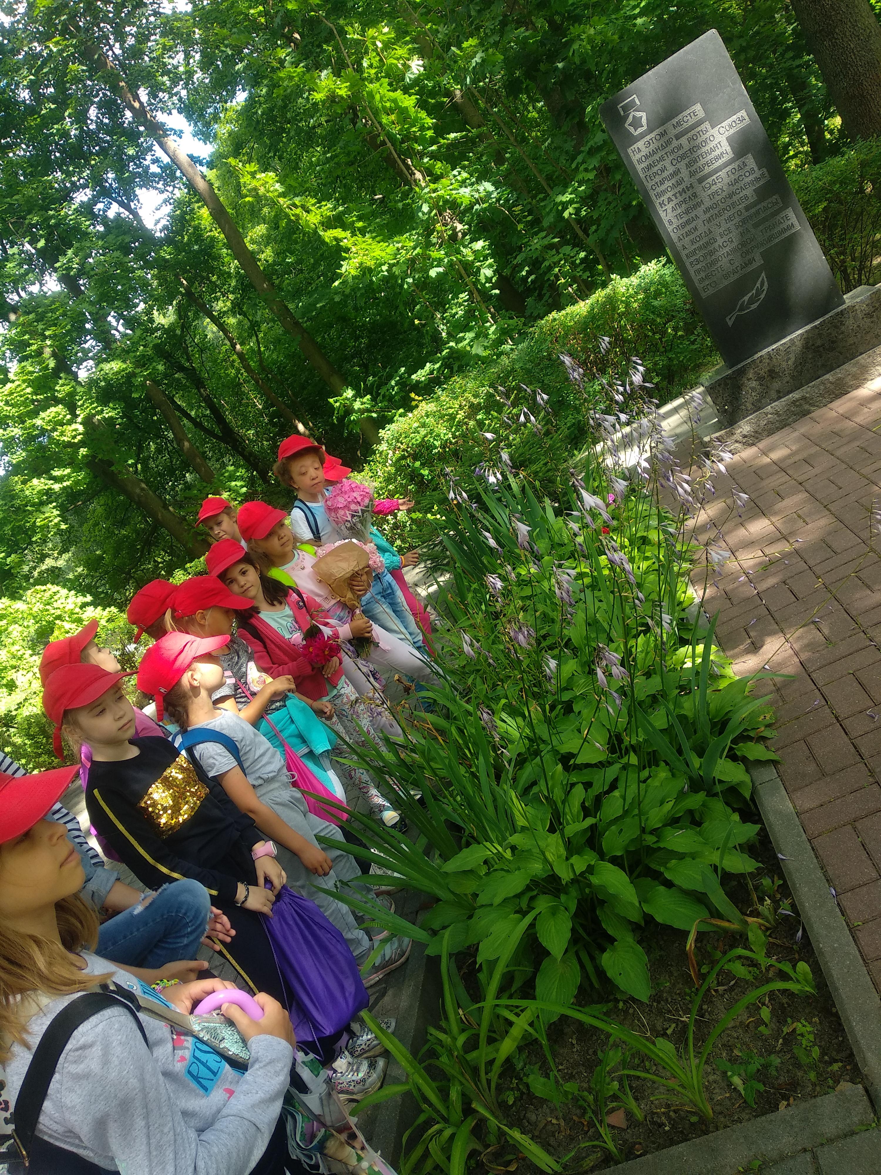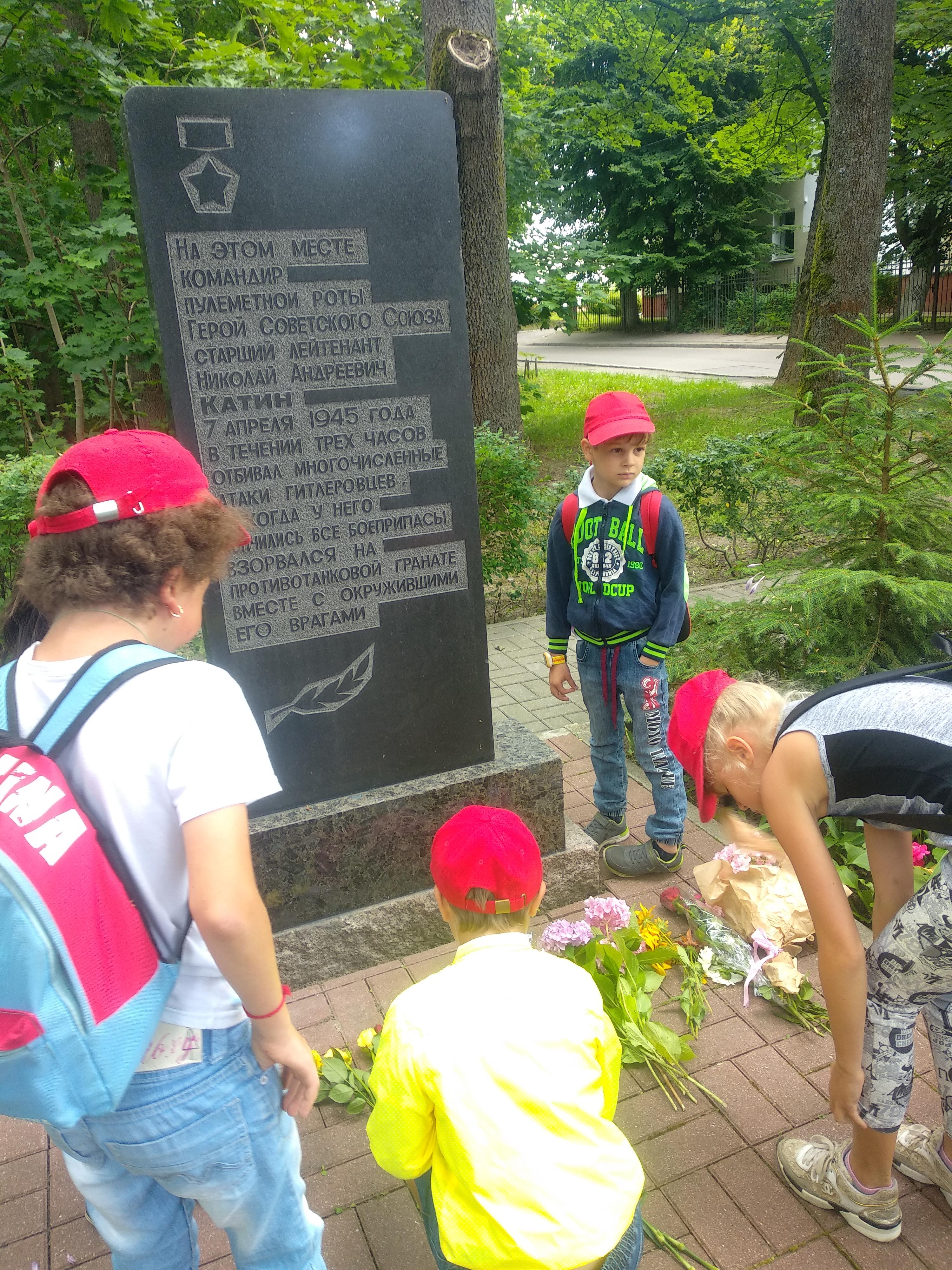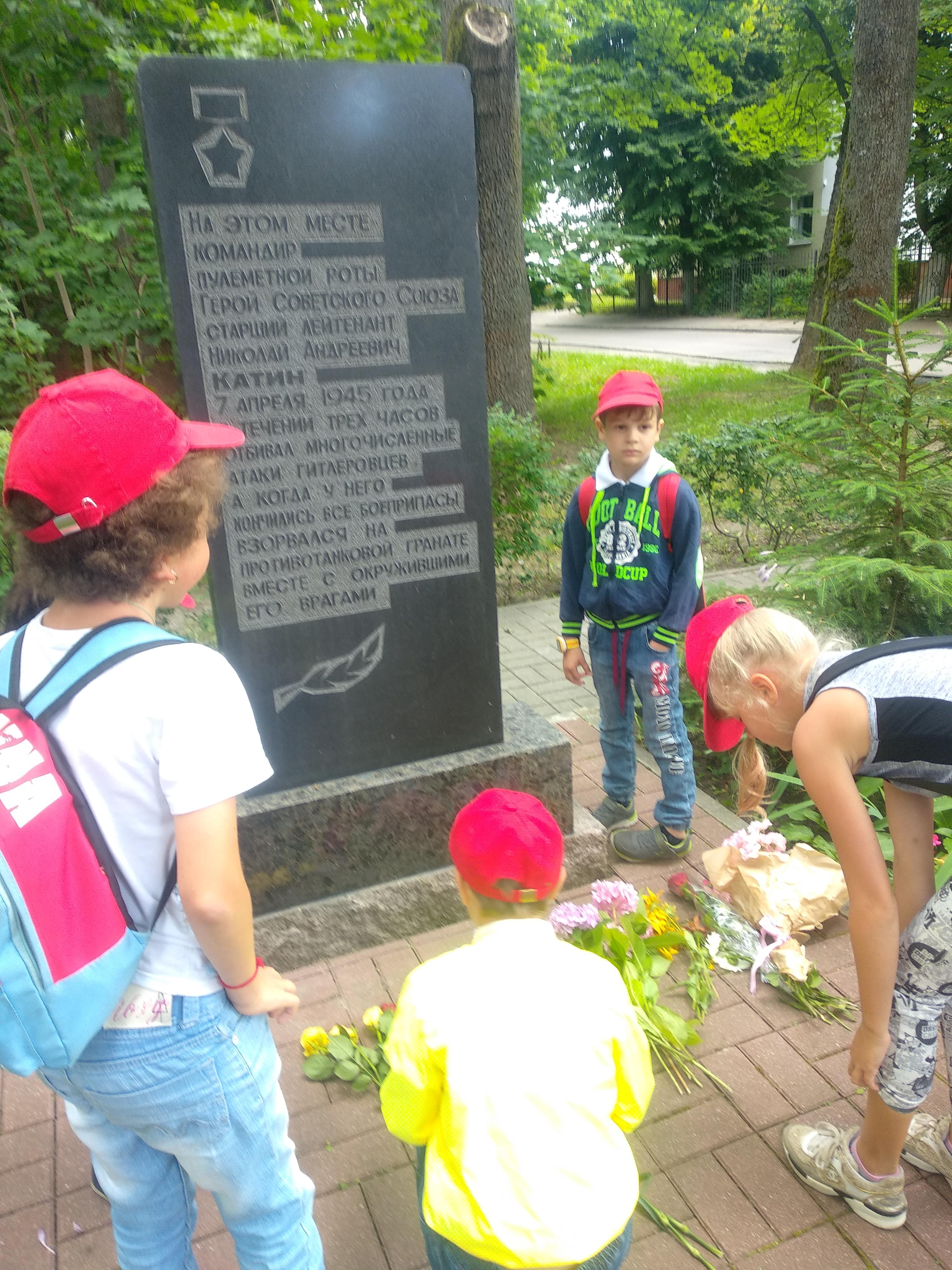 В летнем лагере мы не забываем о годовщине Великой Победы над врагом. Мы провели урок у памятника лейтенанту Катину. Николай Андрееевич Катин не дожил до Победы всего месяц. 7-го апреля 1945 года он погиб. В течение трех часов его рота отбивала атаки превосходящих сил противника. После того, как погибли все его подчиненные, продолжал вести бой. Когда у него кончились боеприпасы, подорвал себя противотанковой гранатой вместе с окружившими его врагами. Мы вернулись в "Родник" и нарисовали счастливых победителей, которые смогли вернуться домой! Низкий вам поклон, прадедушки и прабабушки, бабушки и дедушки, за наш теперешний отдых и спокойное, такое голубое, небо. Спасибо!