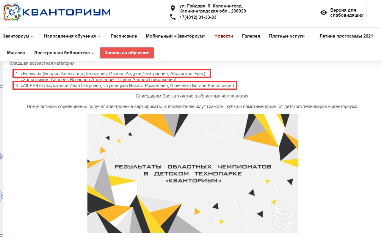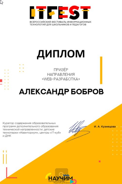 28-е декабря 2020 года: Двое ребят из объединения "Техномир" (педагог Наиль Ринатович Фахретдинов) вошли в число призеров Открытого всероссийского фестиваля информационных технологий «IT-Fest» по направлению "Web-разработка". Декабрь выдался удачным у нас!
