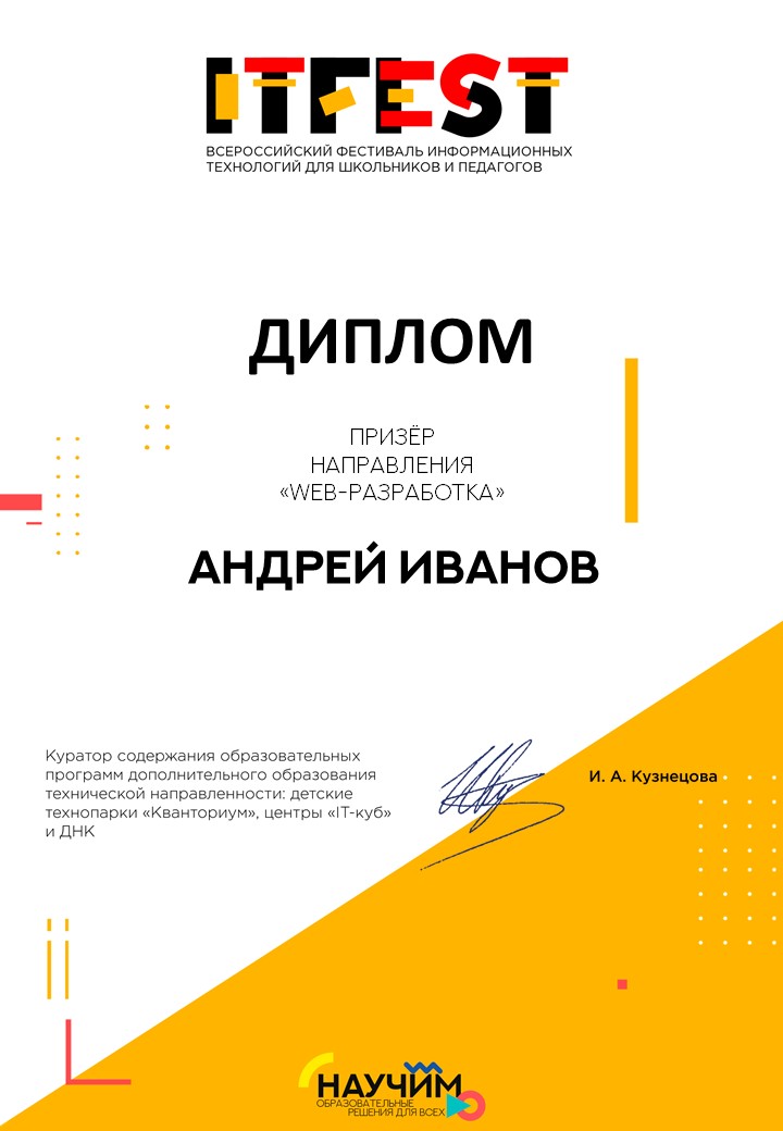 Всероссийский фестиваль информационных технологий «IT-Fest» стал одним из ряда онлайн-мероприятий, организованных в ноябре и декабре 2020 года в рамках образовательного проекта «Научим.online». Только веб-разработку заявились 95 участников из разных уголков России.