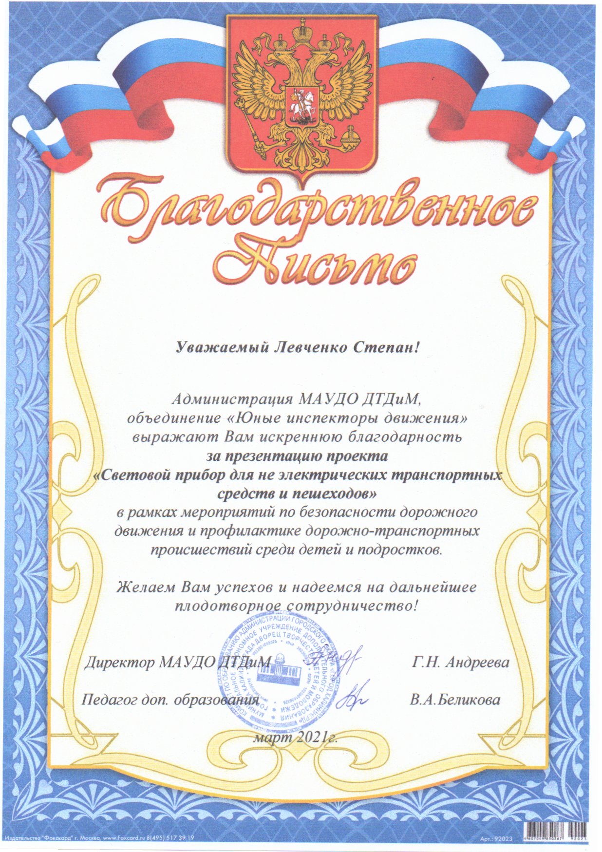 В связи с увеличением количества дорожно-транспортных происшествий с участием велосипедистов, с целью создания условий для безопасности всех участников дорожного движения Левченко Степан представил проект «Световой прибор для не электрических транспортных средств и пешеходов» (руководители: Косс Г.И. - педагог дополнительного образования МАУДО ДДТ «Родник»; Дружининский А.П. - учитель ОБЖ МАОУ гимназии № 32).