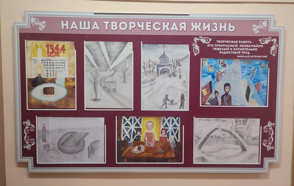 В Доме детского творчества «Родник» прошли классные часы, приуроченные к этой дате. Учащиеся студии ИЗО «Радуга» подготовили выставку рисунков «Блокадной вечности страницы», посвященной подвигу жителей и защитников непокоренного Ленинграда.